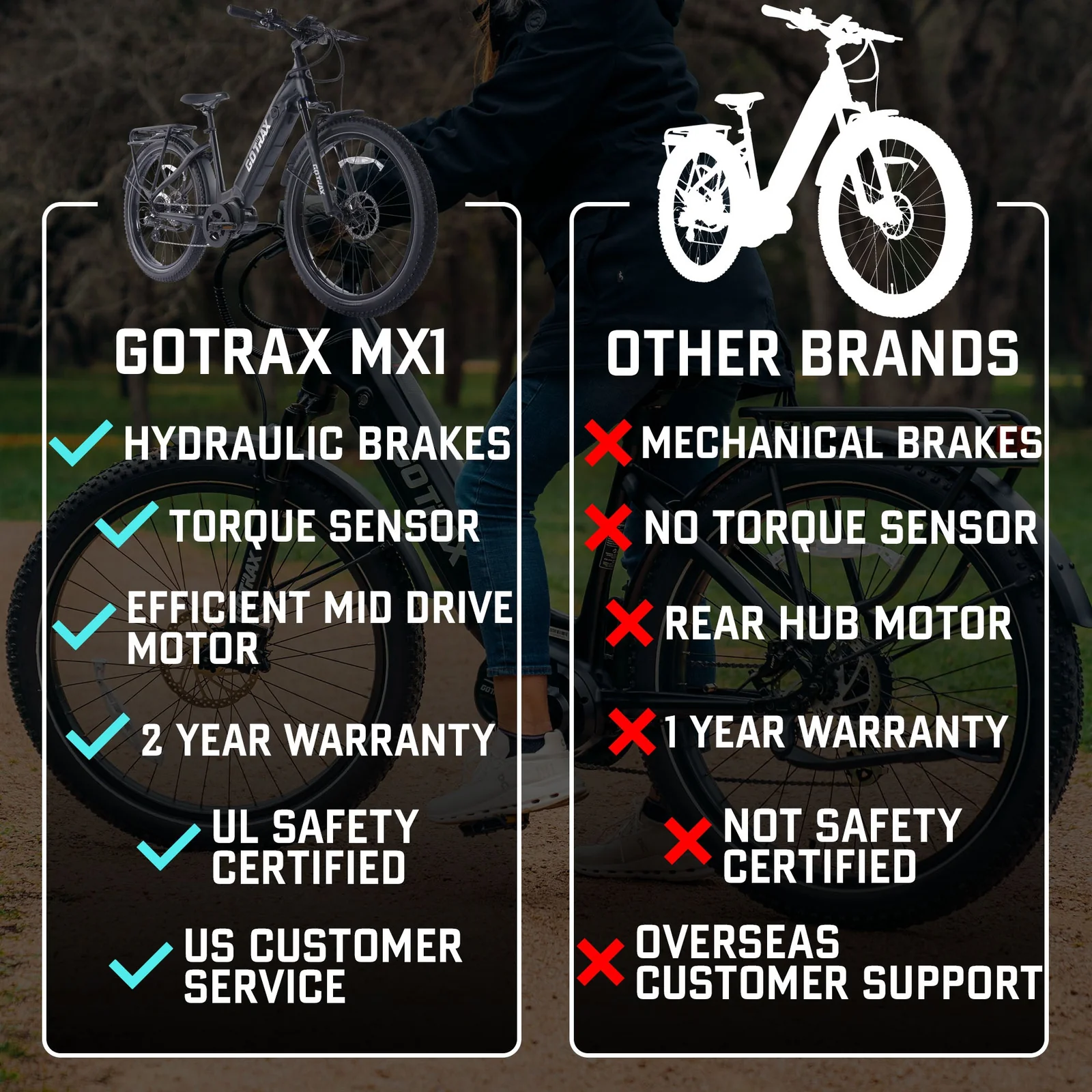 The MX1 stands out because of its mid-drive motor, which delivers power more efficiently than standard hub motors. This means better climbing ability, smoother riding, and improved balance — especially useful for Atlanta roads and hills.