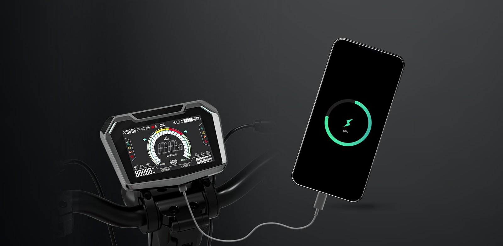Designed with robust motors and a precision-tuned suspension system, it conquers hills and uneven terrain with ease. A large anti-glare display with multiple riding modes and integrated USB charging keeps you connected on the go.