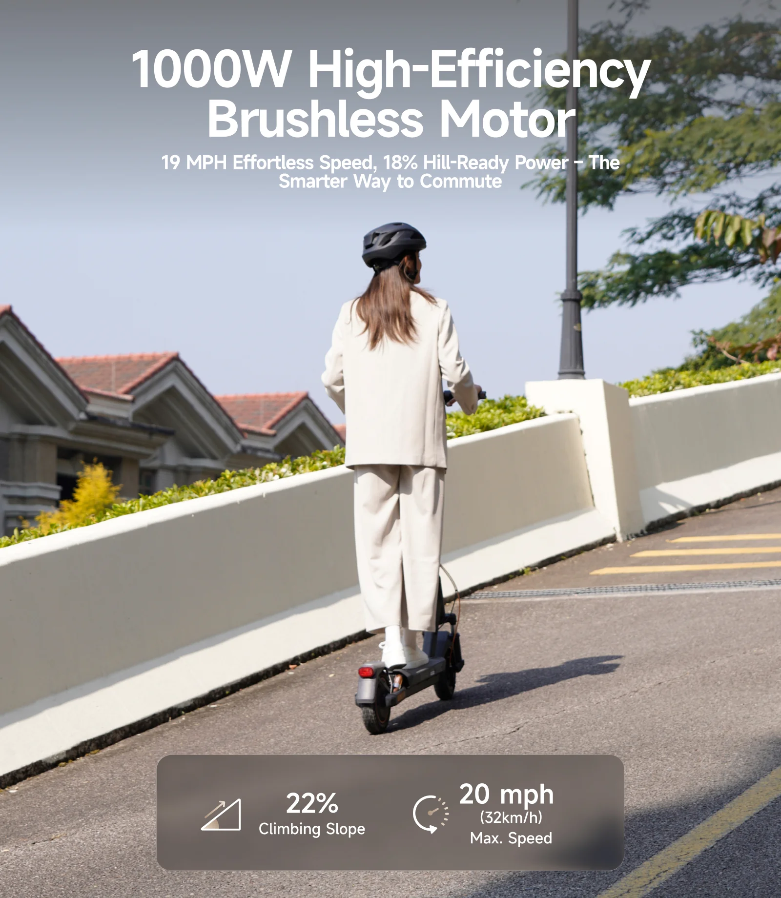 With its powerful 1000W brushless motor, rides up to 20 mph and conquers inclines up to 22%. Easily surge ahead when the light turns green.