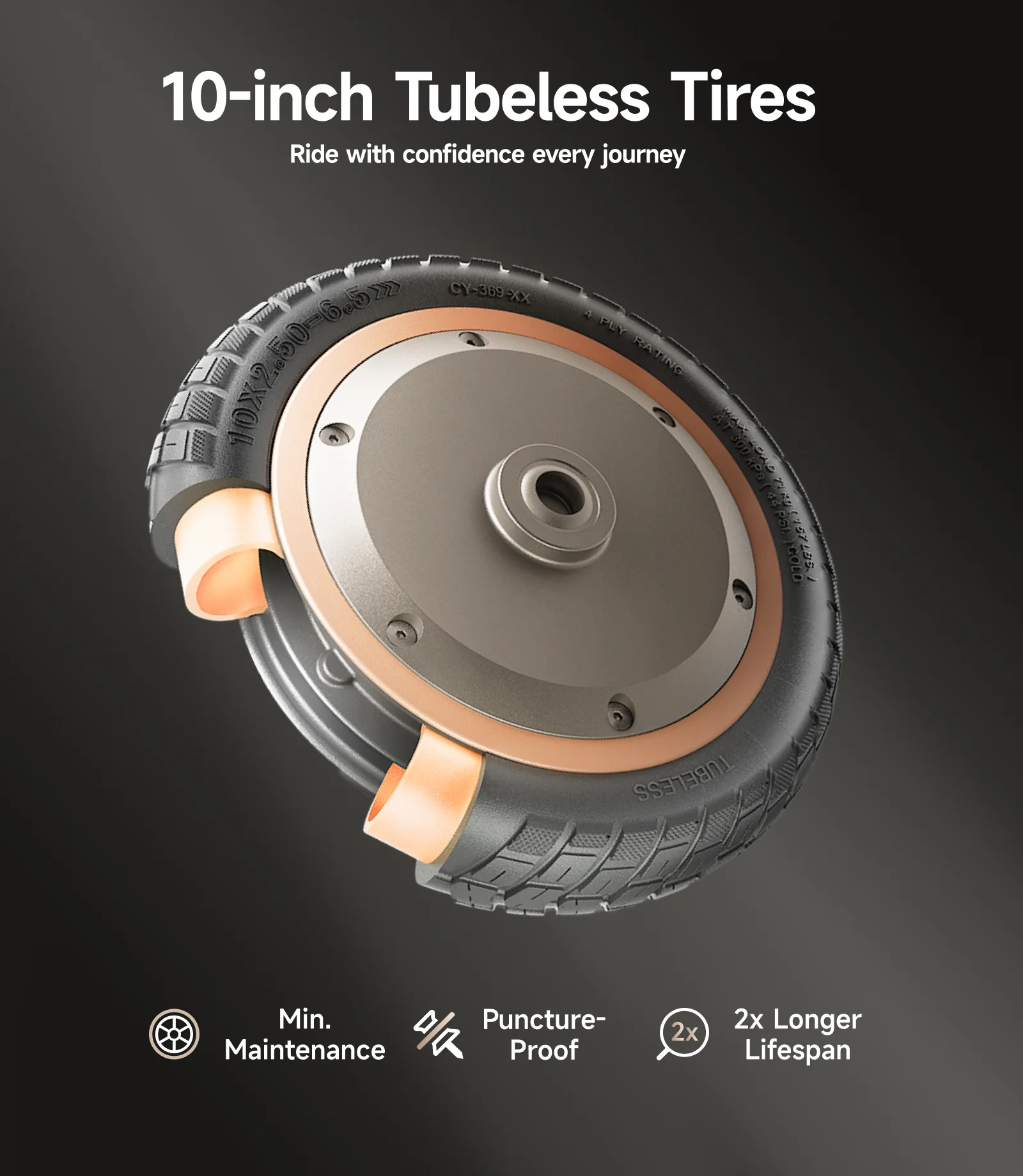 10” tubeless tires provide comfort, stability, and puncture resistance for a smooth, worry-free ride on any terrain.