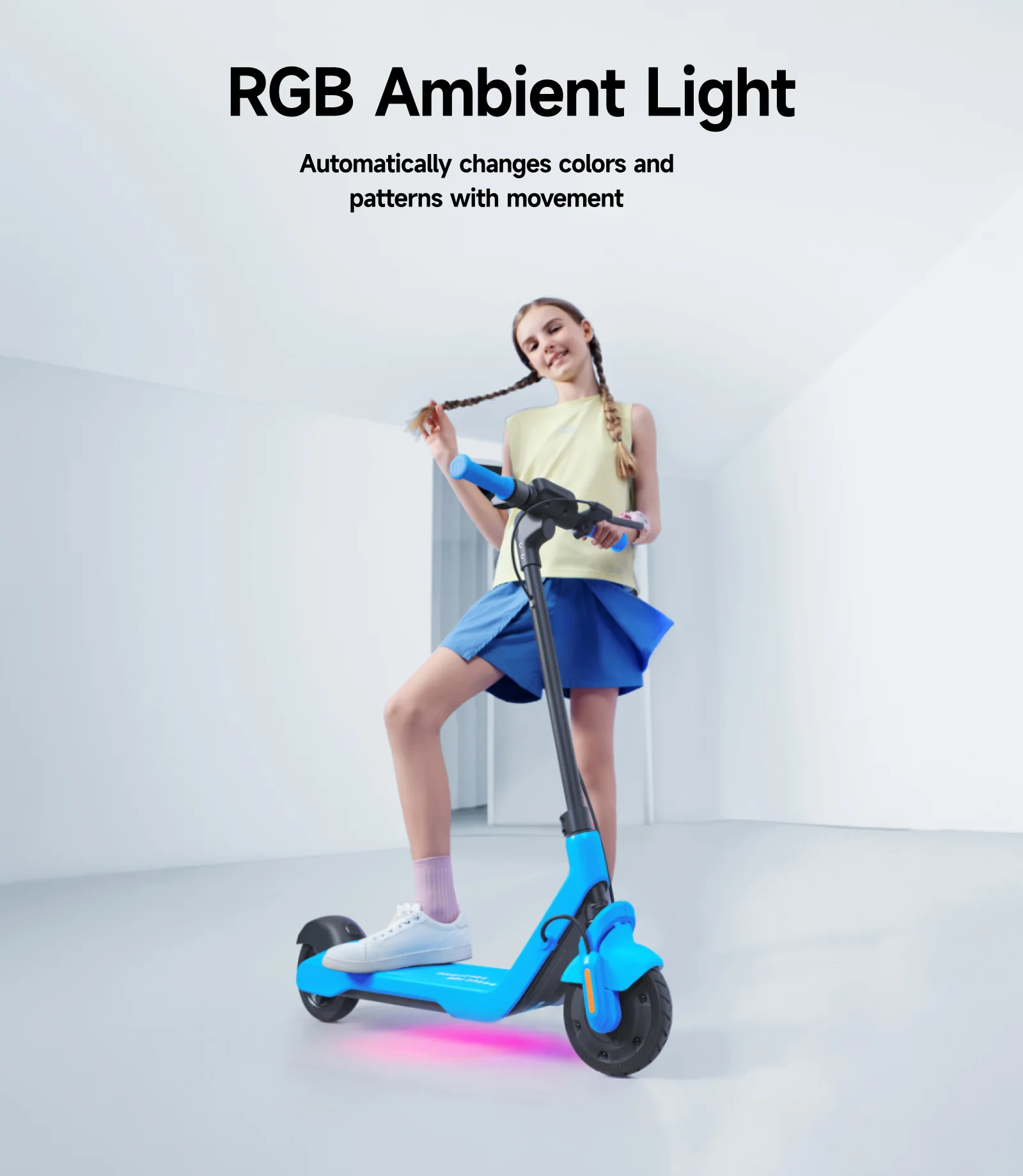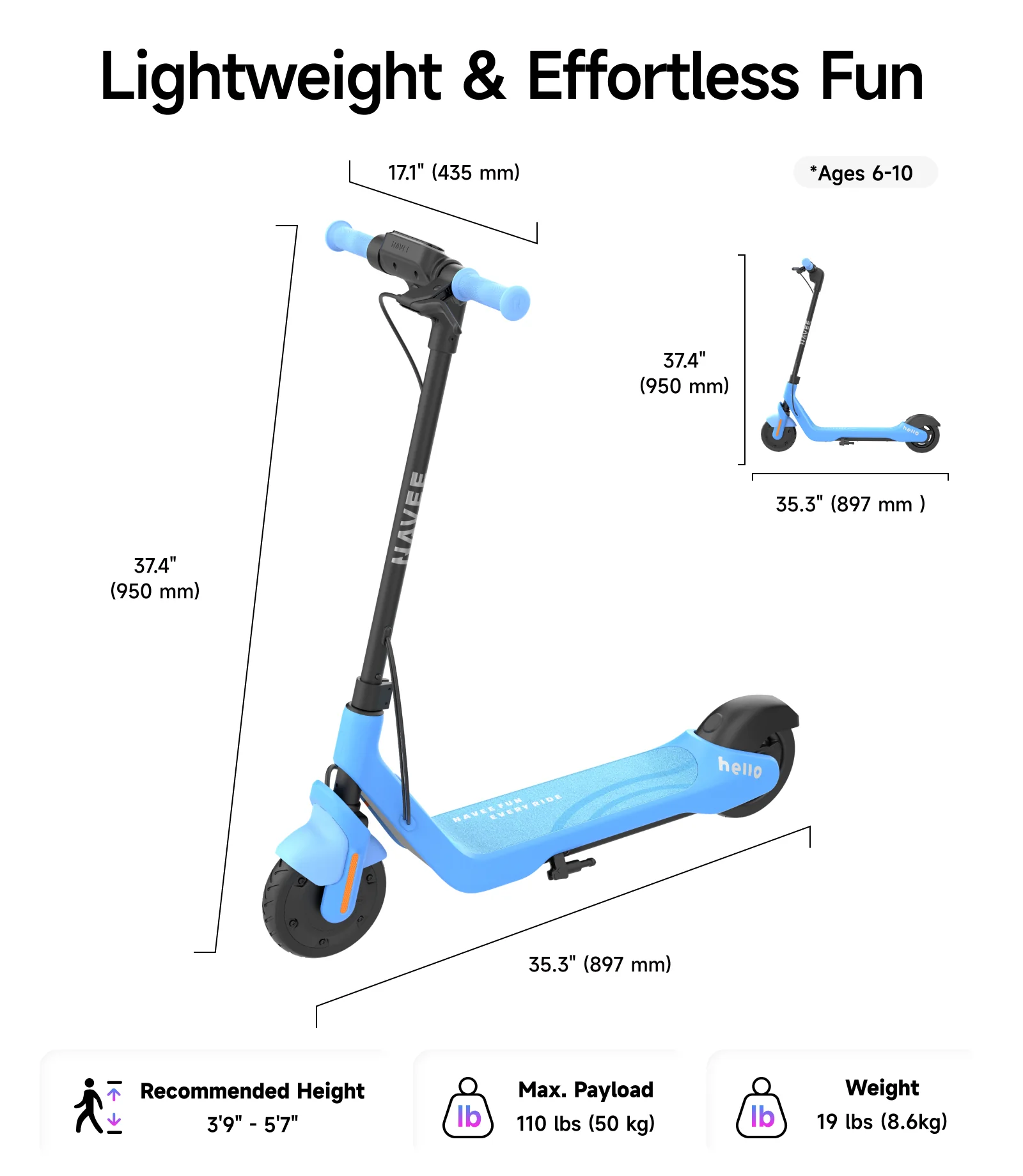 NAVEE Kids Electric Scooters include E (power-assist), D (steady cruise), and S (sport mode, which up to 12.4 mph) so parents can match speed to a child’s confidence. Start in E, step up to D, and use S only for experienced riders with supervision. The speed in different modes varies with different scooter models.