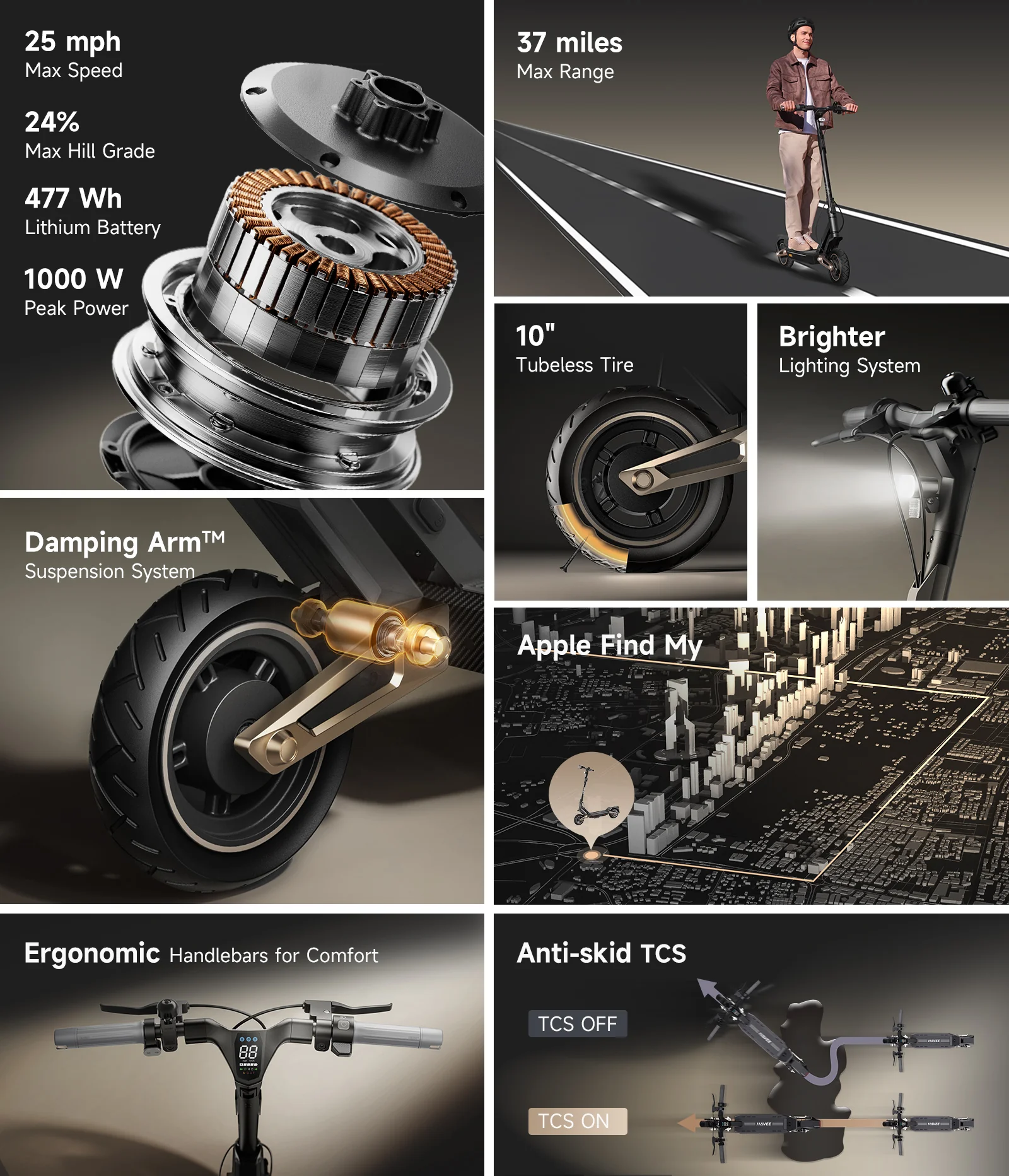 Unlock 24.9 mph fast speed electric scooter, and 24% climbing performance. The self-developed powerful moto let don't worry about your 265Ibs weight.