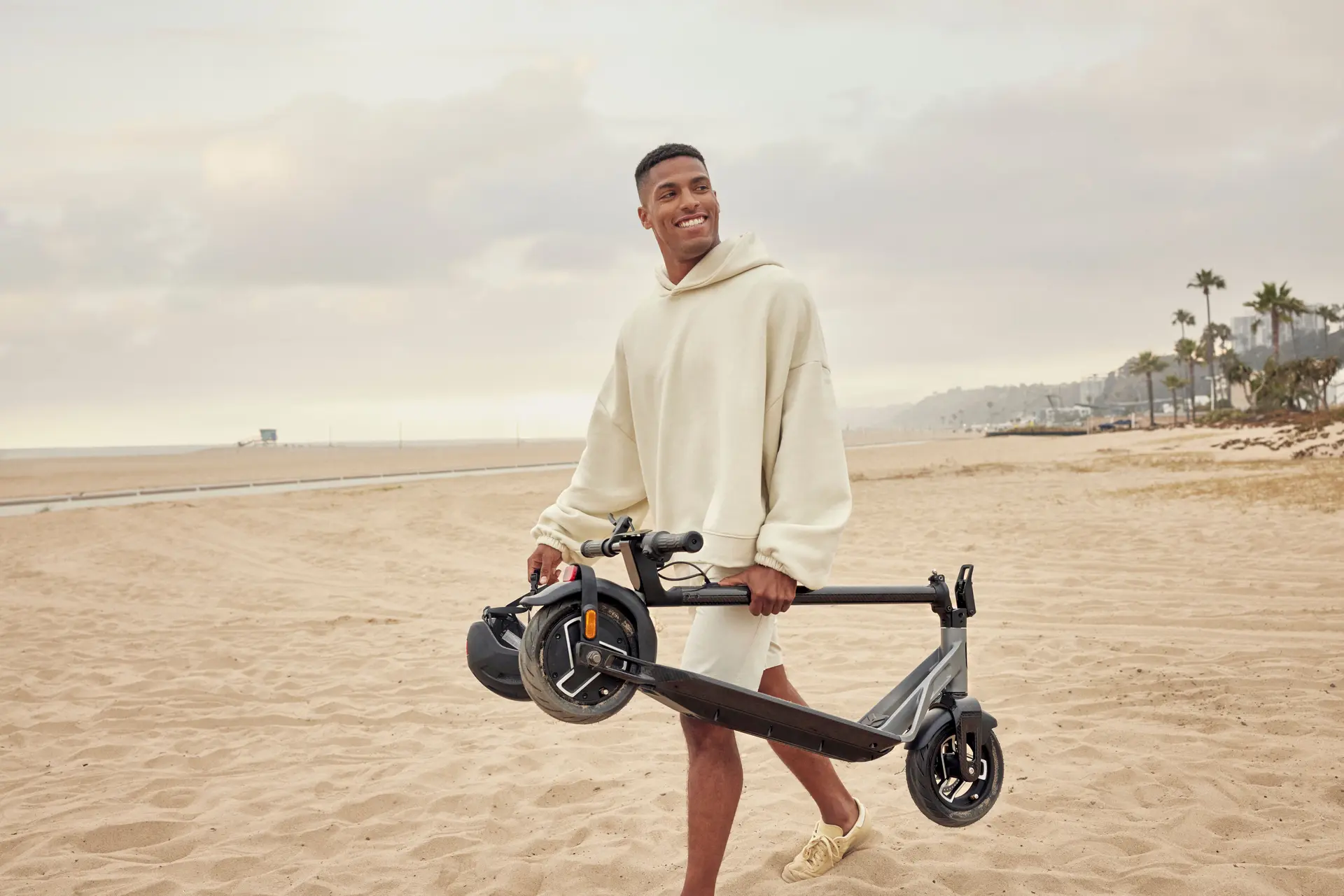 Ultra-light and ultra-portable, the NIU KQi Air X delivers a sleek carbon fiber build, 31-mile range, and 20 mph top speed in a featherweight commuter package—complemented by smart app controls and built-in turn signals.