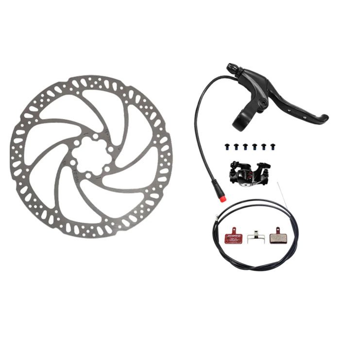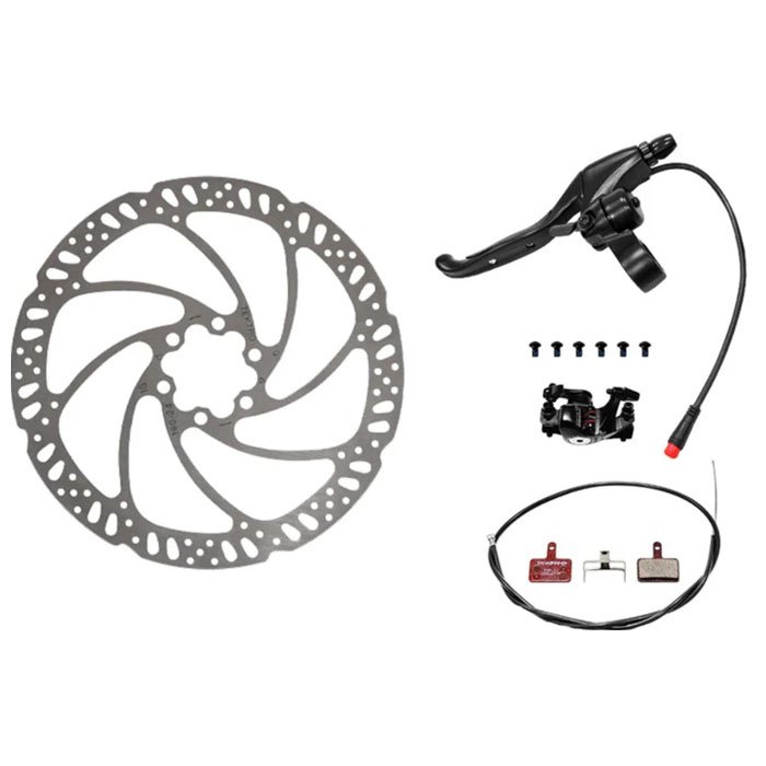Full mechanical kit: includes rotor with pads, caliper, brake cable, and all required screws for plug-in replacement.