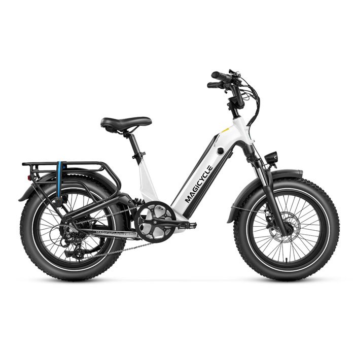 The Magicycle 20″ Deer Step-Thru Full Suspension Ebike SUV is a versatile electric bike designed for both urban commuting and off-road adventures. Equipped with a powerful 750W brushless gear motor (peaking at 1500W) and a high-capacity 52V 20Ah lithium battery, it offers an impressive range of up to 100 miles per charge. The full suspension system, comprising a hydraulic lockout front fork and rear shock absorber, ensures a smooth and comfortable ride across various terrains. Its step-thru frame design facilitates easy mounting and dismounting, catering to a wide range of riders. With features like 20″ x 4″ Kenda fat tires, Tektro 180mm hydraulic disc brakes, and a Shimano 7-speed gear system, the Magicycle Deer is well-suited for both daily commutes and outdoor explorations.
