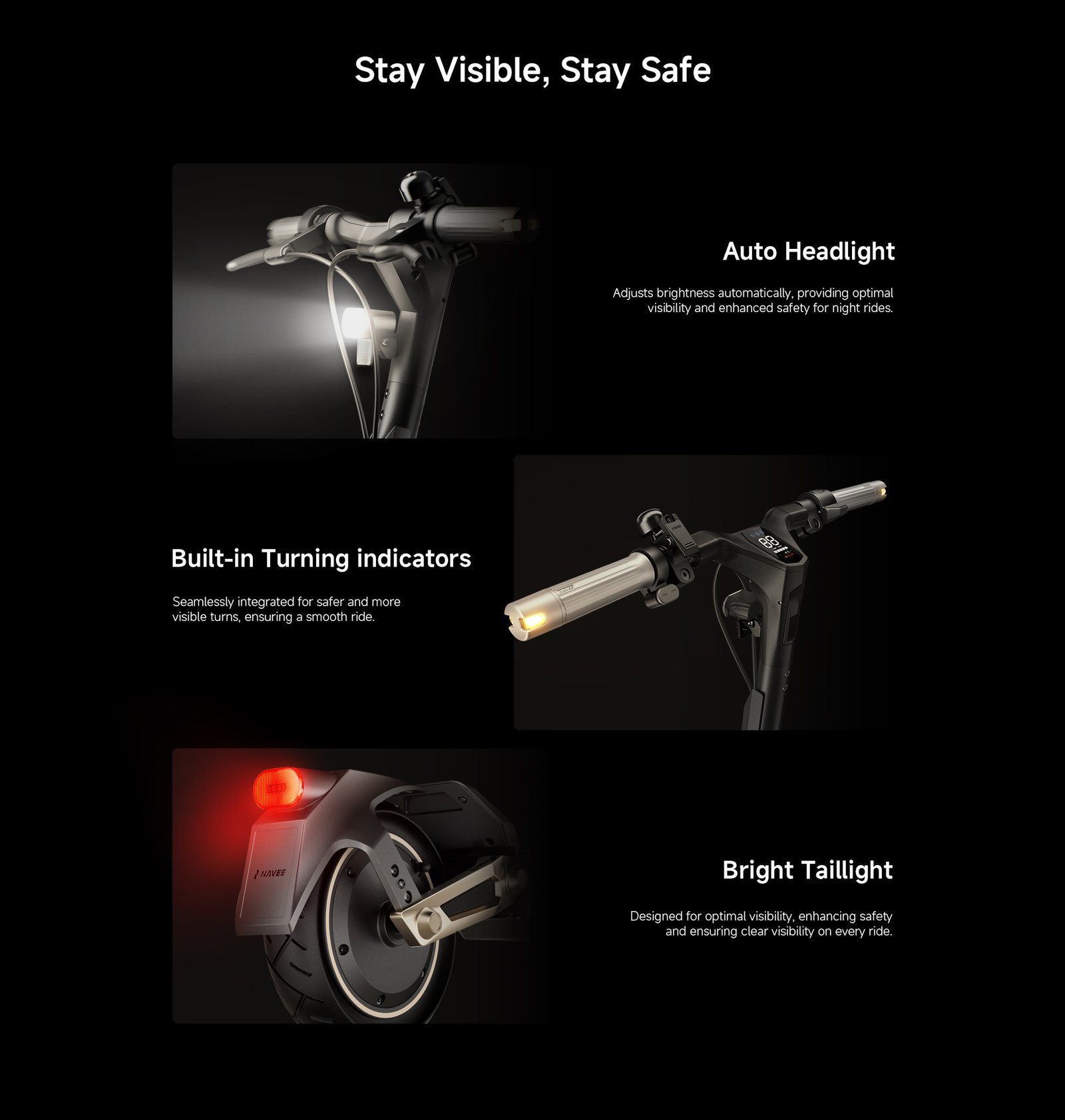Smart lighting: Auto-adjusting headlight, integrated turn signals, and rear taillight.