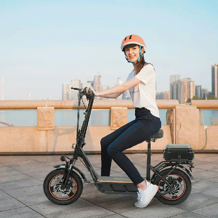 Powerful electric scooter with a 750W motor, 28 mph top speed, 31-mile range, large 14″ tires, and dual disc brakes—great for commuting and leisure riding.